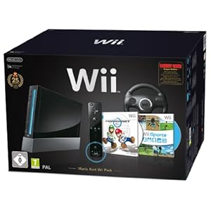 Das ist wirklich das All-Inklusive Pack für die Wii. Die Wii selbst mit Wii Sports,Super Mario Kart inkl. Lenkrad, Remote Plus Controller inkl. Motion Plus – alles dabei! Und super edel in schwarz – passend zum ganzen Wohnzimmer Hightech-Krempel 😉