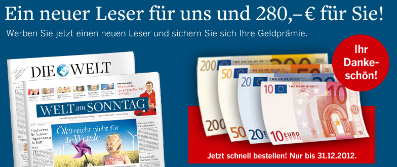 Durch eine aktuell wirklich sehr hohe Bargeldprämie von 280,- Euro könnt Ihr gerade das Jahresabo der „Die Welt“ und der „Welt am Sonntag“ 562,80 Euro effektiv für nur 282,80 Euro lesen.