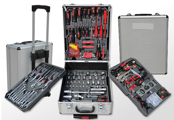 Der Händler schreibt über dieses Angebot: „Werkzeugkoffer mit 226 Teilen inklusive praktischem, abschließbaren Aluminium-Koffer mit Trolleyfunktion (mit abnehmbarem Griff) Damit ist dieses Set der ideale Begleiter für den ambitionierten Heimwerker ob zuhause oder unterwegs. Die einzelnen Werkzeugeinsätze können auch an der Wand aufgehängt werden.“