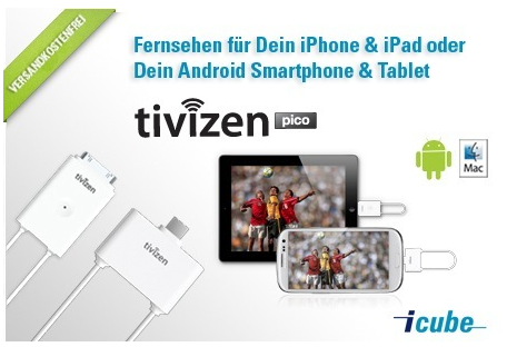 Der Händler schreibt über dieses Angebot: „Mobiler, ultrakompakter TV-Tuner für Live DVB-T-Fernsehen auf dem Smartphone oder dem Tablet. Keine Internet- oder 3G-Verbindung nötig – tivizen Pico geht mit eigener Antenne auf Sendung. Inklusive EPG und Aufnahmefunktion. Bis zu 9 Stunden (Apple) bzw. bis zu 7 Stunden (Android) Live-TV-Genuss. Kostenlose App im Apple App Store oder auf Google Play erhältlich.“