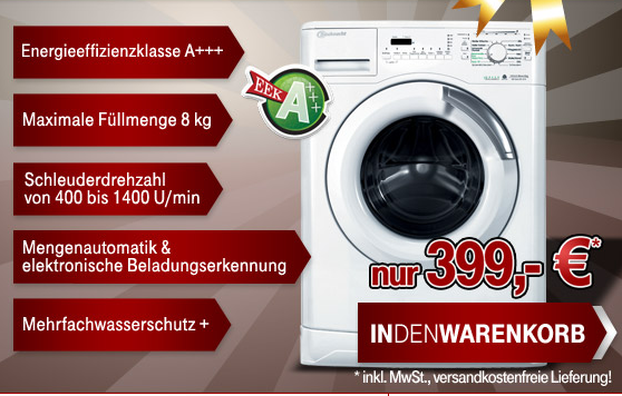 Im T-Online Shop, der jetzt 004.de heißt, gibt es gerade die Bauknecht WA Sens XXL 814 Waschmaschine Frontlader (A+++ B, 1400 UpM, 8 kg, Weiß, Clean+, Woolmark) für nur 399,- Euro inkl. Versand.
