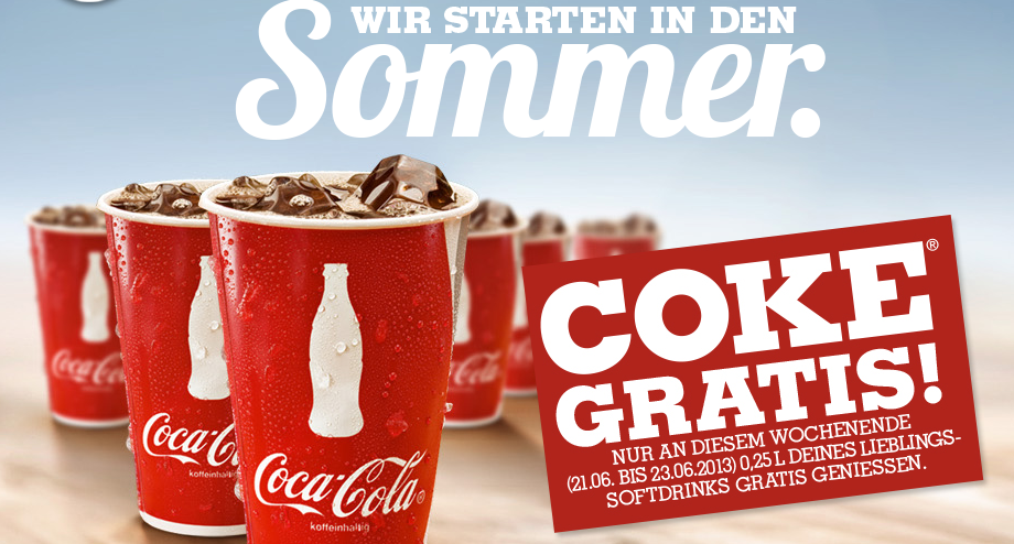 Wer unterwegs ist und eine schnelle Erfrischung braucht, der sollte dieses Wochenende mal bei Burger King vorbei schauene. Hier bekommt ihr nämlich momentan einen Softdrink (0,25 Liter) gratis.