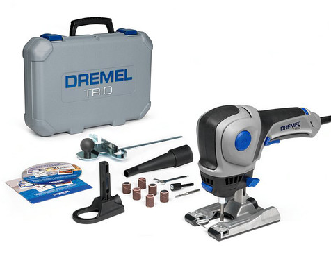 Der Händler schreibt über das Werkzeug: „Der Dremel Trio hat ein 3-in-1-Spiralsystem, das es Ihnen ermöglicht, mit ein und demselben Werkzeug zu schneiden, zu schleifen und zu fräsen. Dieses vielseitige, kompakte und leichte Werkzeug ist sehr leistungsstark! Der Dremel Trio bietet eine ausgezeichnete Ergonomie, zwei Griffstellungen und eine variable Drehzahleinstellung, was eine optimale Arbeitsleistung in verschiedenen Materialien gewährleistet. Mit seiner 360°-Spiralschneidetechnologie und Tauchschnittfähigkeit ermöglicht das Werkzeug schnelle und freihändige Schnitte in Holz, Kunststoffen, Trockenwandelementen, Metall und Wandfliesen.“