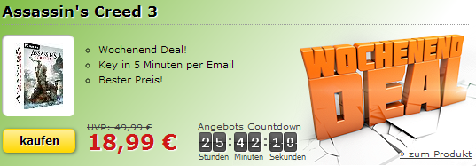 Bei MMOGA bekommt ihr heute das Spiel Assassin’s Creed 3 als Key für den Ubi Launcher für nur 18,99 Euro inkl. Versand.