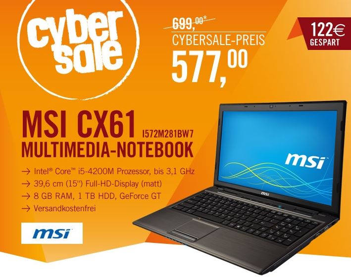 [CYBERPORT] Cybersale! MSI CX61-i572M281BW7 15″ Gaming-Notebook mit mattem Full-HD Display für nur 577,- Euro inkl. Versand