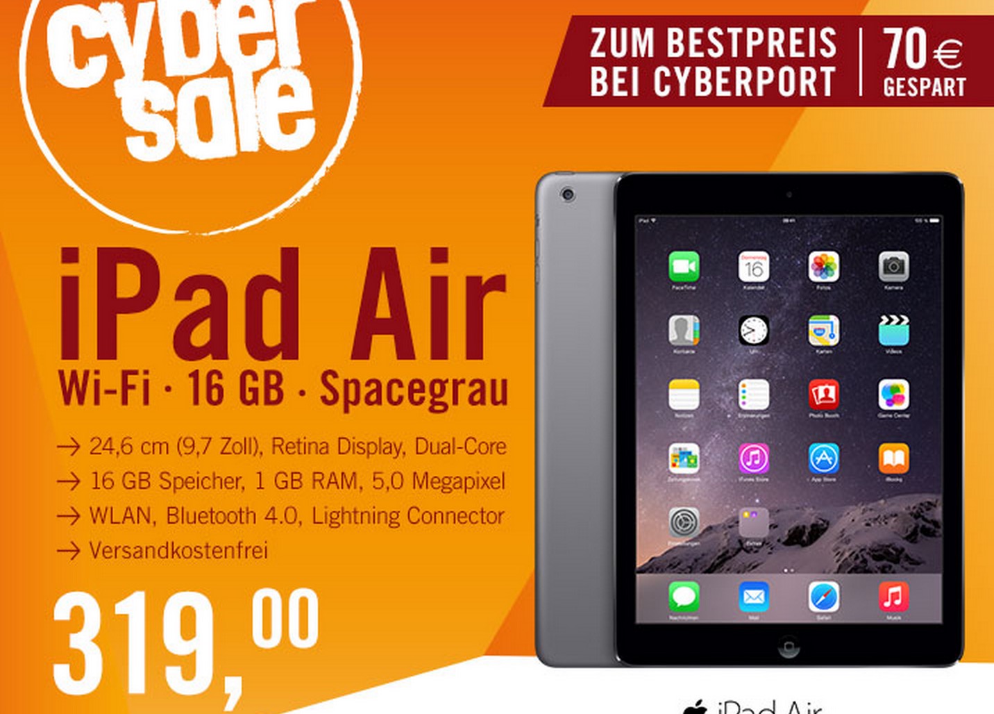 Bei Cyberport gibt es heute im Cybersale das Apple iPad Air Wi-Fi 16 GB Spacegrau für nur 319,- Euro inkl. Versand.