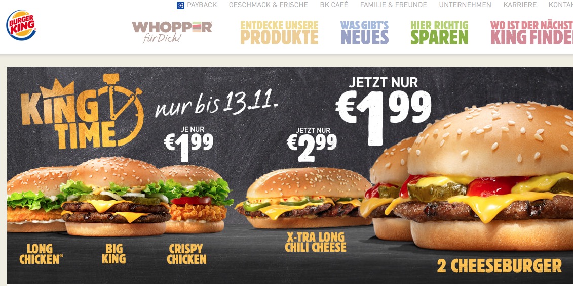 Burger King schreibt zur Aktion: „Große Burger zu kleinen Preisen in der King Time. Mit dabei der X-Tra Long Chili Cheese für unglaublich günstige 2,99 € und für gerade mal 1,99 € der Long Chicken, der Crispy Chicken, der Big King oder jetzt auch 2 Cheeseburger. Na, wenn das kein Grund ist, gleich mehrere Deals zu machen. Gültig vom 09. bis 13. November. Nur bei Burger King.“