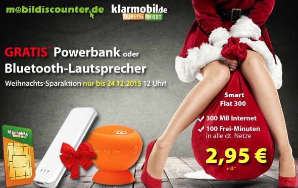 ++ NUR NOCH HEUTE ++ Beim Mobildiscounter gibt es zur Zeit eine Internet-Flatrate und 100 Minuten im Telekom-Netz für nur 2,95 Euro monatlich – und jetzt sogar zusätzlich ein Bluetooth Lautsprecher oder eine Powerbank geschenkt…