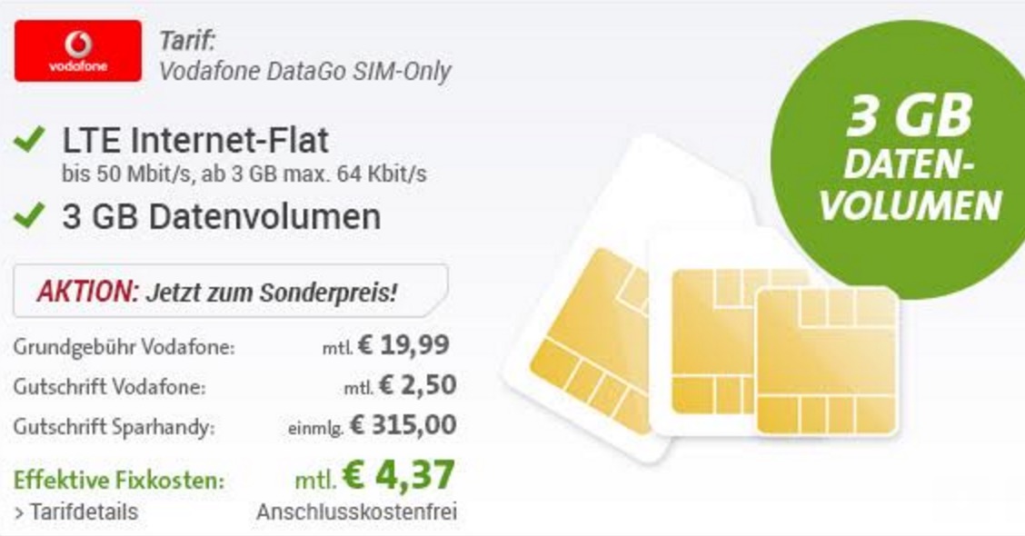 Sparhandy bietet euch dieses Wochenende wieder diesen genialen Tarif: Die Vodafone DataGo M 3GB LTE-Flatrate für nur 17,49 Euro monatlich + 315,- Euro Bargeld-Auszahlung!