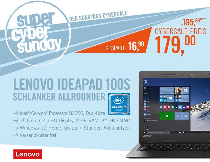 Bei Cyberport gibt es heute im Cybersale das Lenovo IdeaPad 100S-14IBR Notebook N3050 mit Windows 10 für nur 179,- Euro inkl. Versand.