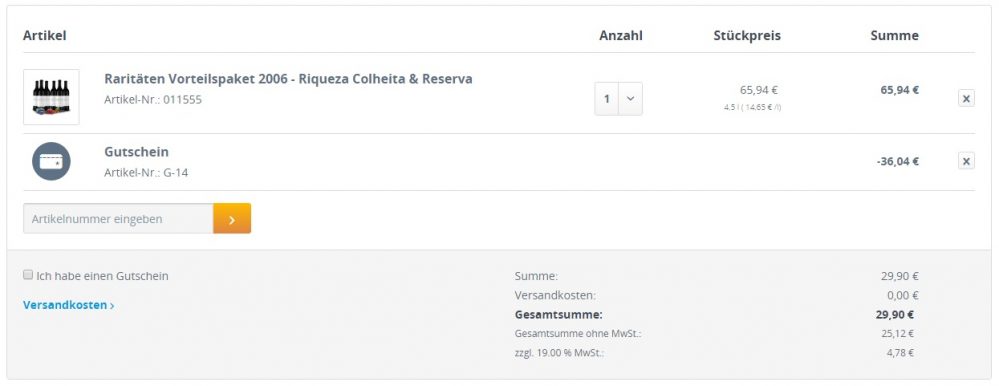 Über das Paket heißt es: “In diesem Vorteilspaket genießen Sie 10 Jahre gereifte Premium-Rotwein-Raritäten aus Portugal jetzt versandkostenfrei und unschlagbar günstig! Sie erhalten 3 Flaschen Riqueza Colheita Vinho Tinto 2006 sowie 3 Flaschen Riqueza Reserva Vinho Tinto 2006. Nur extrem selten kommt man an einen Premium Rotwein aus dem begehrten Douro-Tal der stolze 10 Jahre zu seiner Perfektion reifen konnte!”