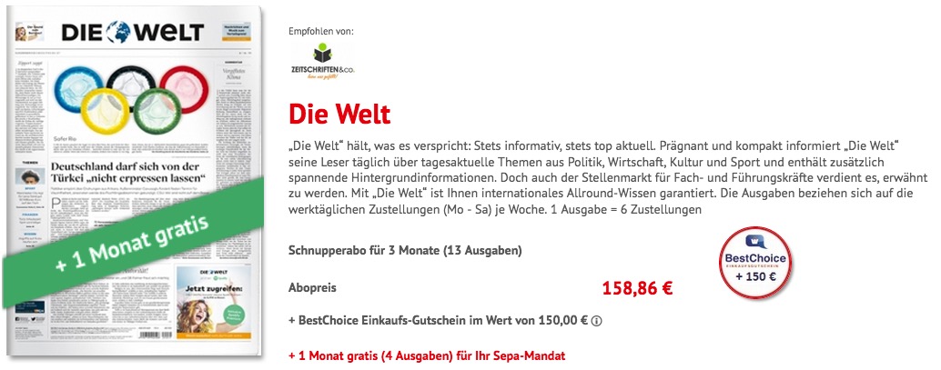 Wahnsinn! Jetzt bekommt ihr ganze 102 Ausgaben „Die Welt“ für 158,86 Euro inkl. Zustellung bei SEPA-Mandat – es gibt eine Prämie über 150,- Euro Bestchoice.