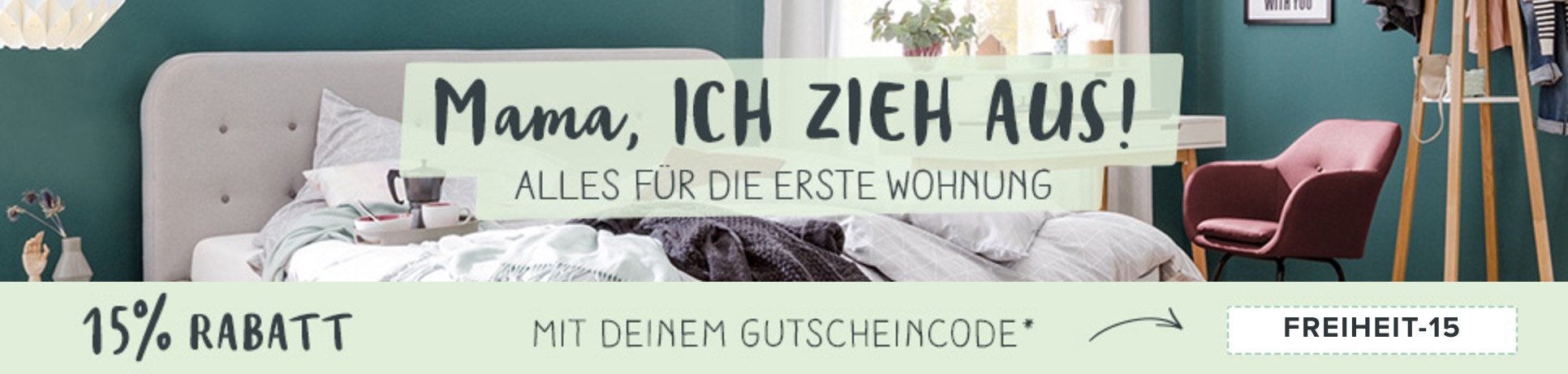 Im Home24 Onlineshop erhaltet ihr heute unter dem Motto „Mama, ich zieh aus!“ satte 15% Rabatt auf eure ersten eigene Wohnungsausstattung.