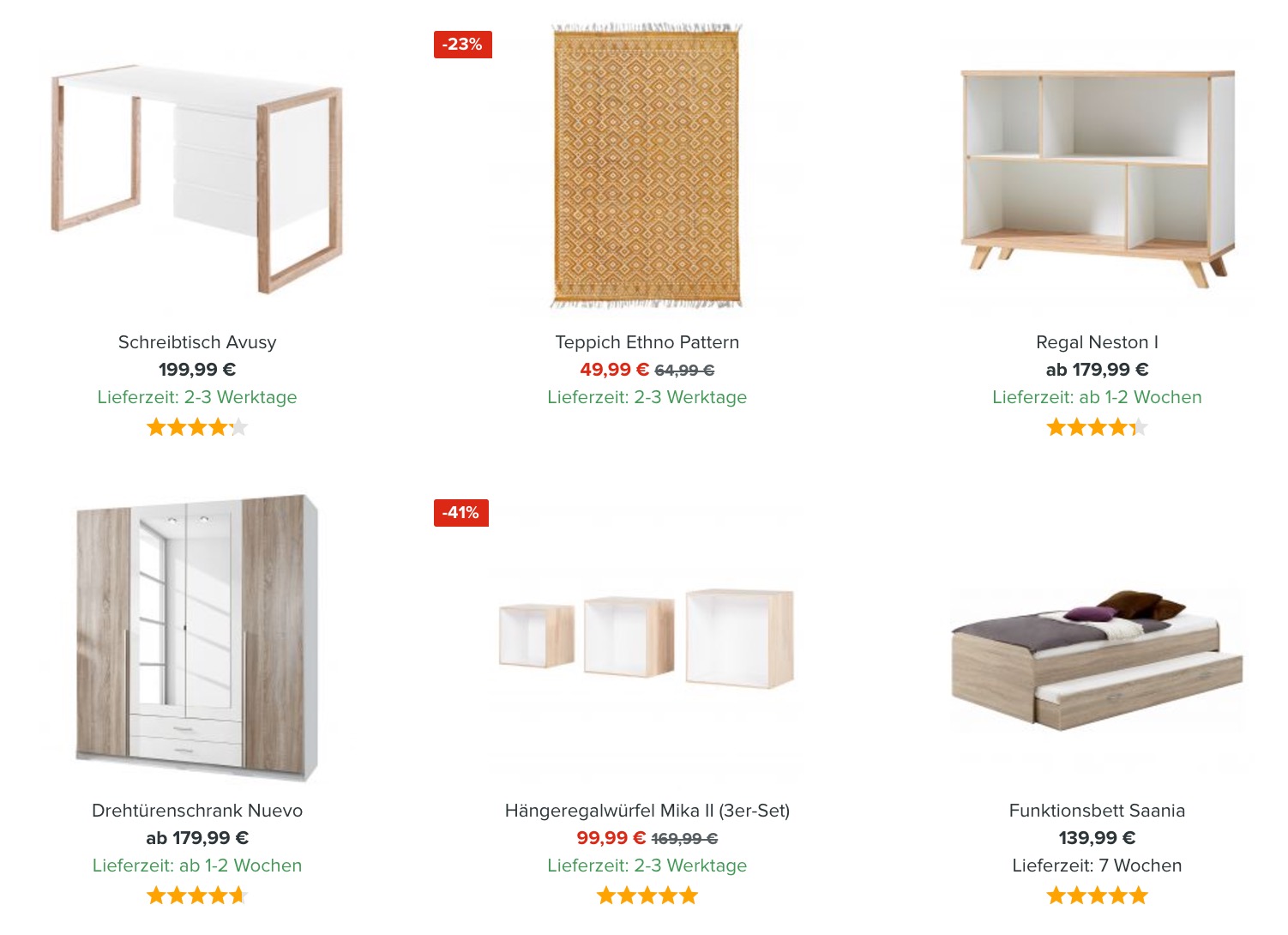 Auf der Aktionsseite findet ihr eine Menge Artikel, welche bereits teilweise satt reduziert sind. Darunter unter anderem die Kategorien Stühle, Tische, Betten oder Stauraum- sowie Accessoires-Artikel.