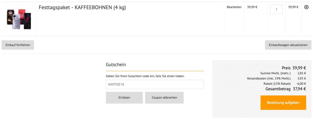 Um auf den Preis zu kommen, nutzt ihr bitte im Warenkorb den Gutscheincode KAFFEE15