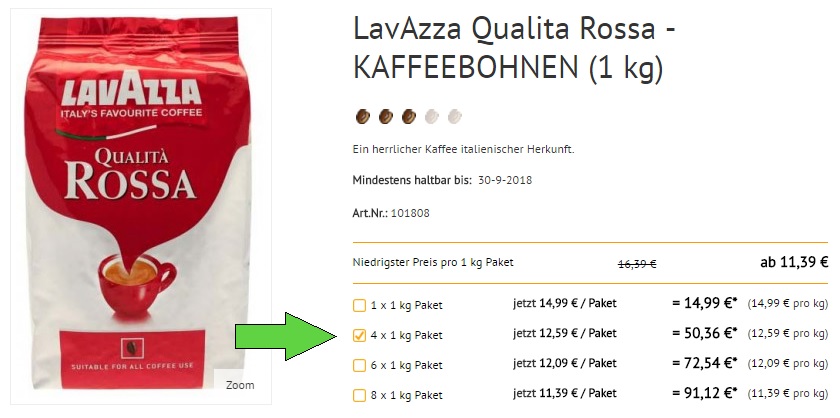 Wählt auf der Produktseite einfach das „4x 1kg Paket“ aus und gebt im Warenkorb anschließend den Gutscheincode LAVAZZA50 ein.