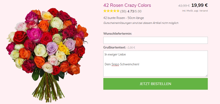 Als Wunschliefertermin könnt ihr zwischen dem 22. bis 28. Februar wählen und für 1,- Euro Aufpreis könnt ihr die Blumensendung mit einem persönlichen Gruß versehen.