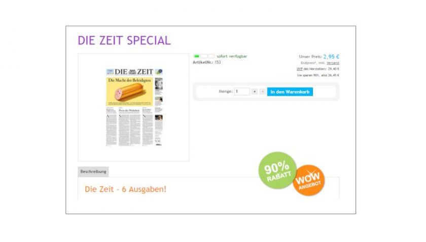 Aktuell könnt ihr euch komplett stressfrei 6 Ausagen der Zeitschrift „Die Zeit“ für nur 2,95 Euro sichern.