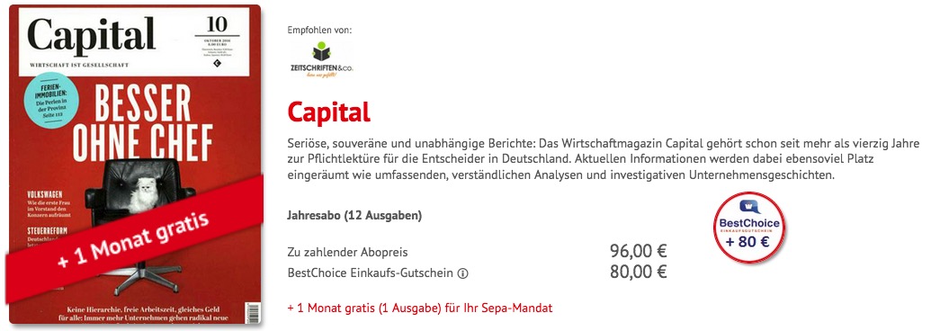 Alternativ gibt’s auch die Capital inkl. Digital im Jahresabo für 105,96 Euro und dazu für den Prämienempfänger ein Amazon-Gutschein über 70,- Euro.