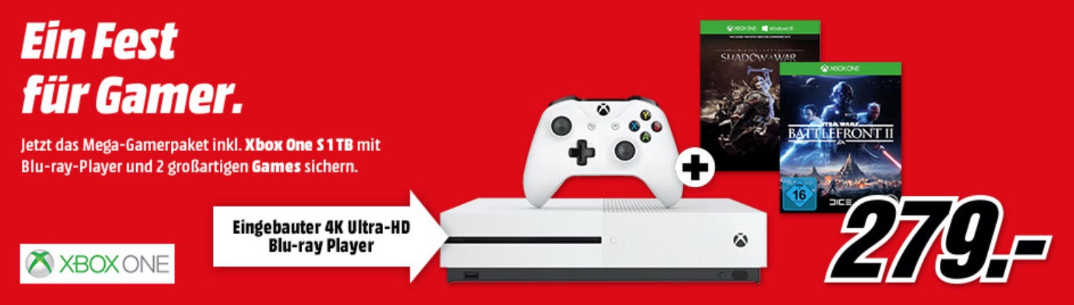 Bei MediaMarkt gibt es aktuell die Microsoft Xbox One S 1TB im Bundle mit Mittelerde: Schatten des Krieges und Star Wars Battlefront II für nur 279,- Euro.