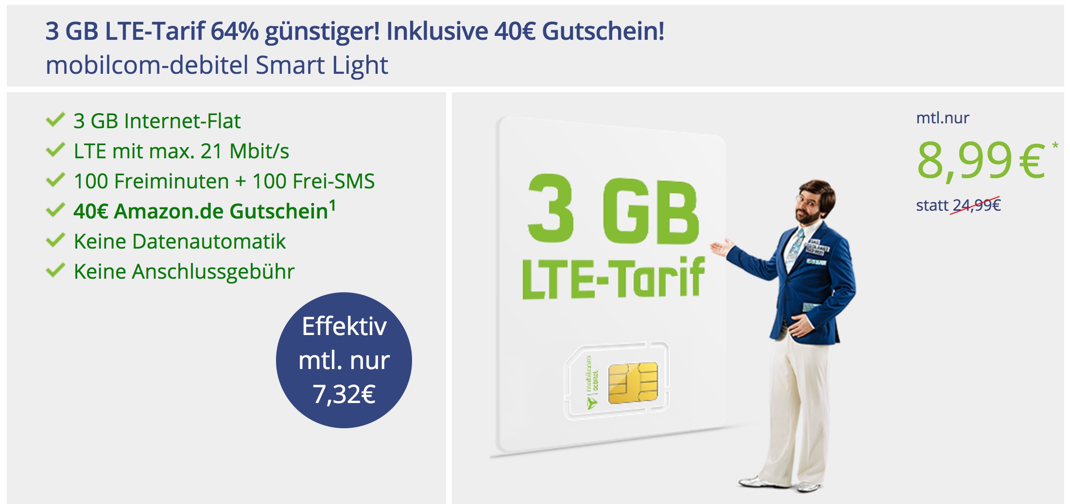 Ihr bekommt den Mobilcom-Debitel o2 Smart Light Tarif mit 3GB Datenvolumen + 100 Freiminuten und 100 Frei-SMS für nur 8,99 Euro monatlich!