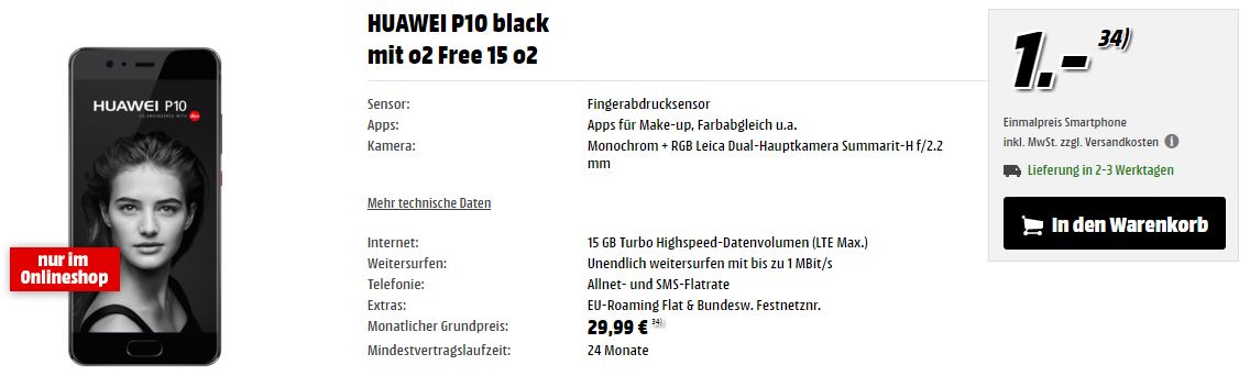 Aktuell gibt’s bei MediaMarkt einen echt feinen Mobilfunk-Deal: Ihr bekommt den o2 Free 15 mit Allnet-, SMS- und 15GB LTE-Flat für nur 29,99 Euro monatlich und erhaltet oben drauf für nur einmalig 1,- Euro das HUAWEI P10 black!
