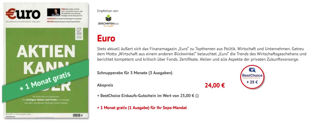 Bei der Kioskpresse gibt’s heute 4 Monate „Euro“ (bei SEPA-Mandat) für nur 24,- Euro – als Prämie: 25,- Euro Bestchoice-Gutschein
