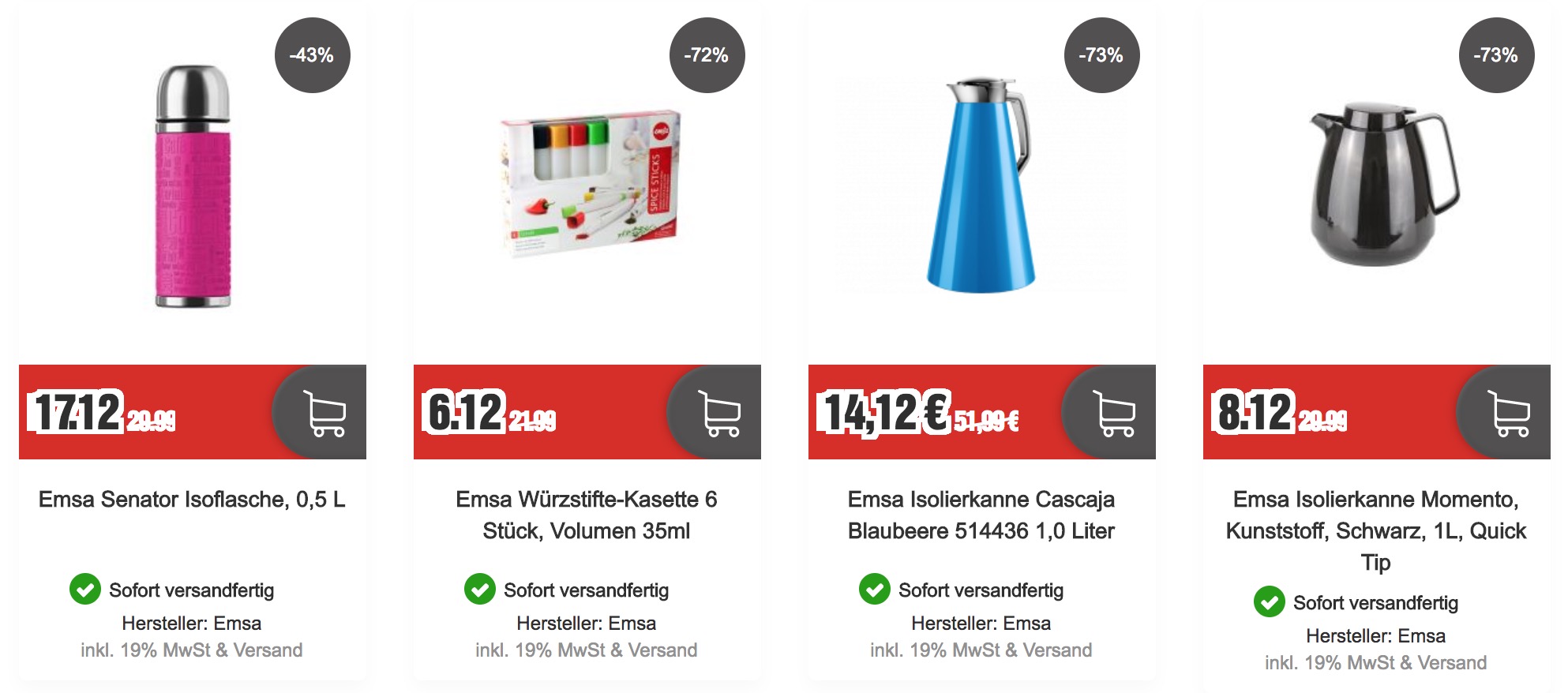 Insgesamt findet ihr in der Kategorie knapp 40 verschiedene Produkte. Neben Isolierflaschen und -kannen von Emsa, gibt es auch Frischhaltedosen, Besteck, Töpfe oder Pfannen.