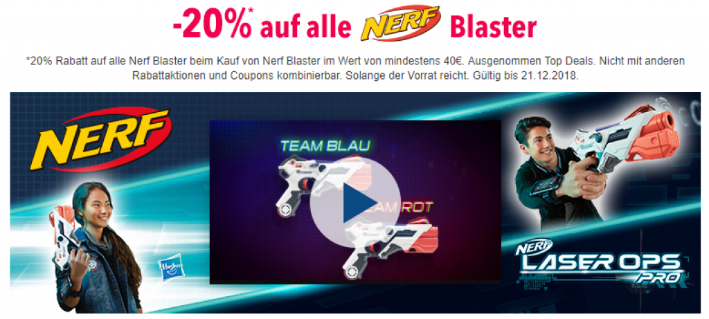 Im Toys’R’Us Onlineshop bekommt ihr gerade 20% Rabatt auf alle NERF Blaster.