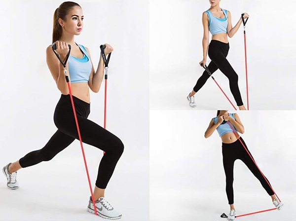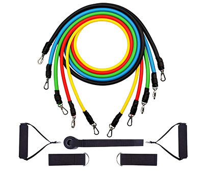 - 12-teiliges Set: 5 verschiedene Gymnastikbänder [Schwarz(13,6 kg) > Blau (11,3 kg) > Rot (9 kg) > Grün (6,8 kg) > Gelb (4,5 kg)], 2 Anti-Rutsch-Griffe, 1 Premium-Türanker, 1 Trainingsanleitung (evtl. nicht in deutscher Sprache) und 1 Tragetasche