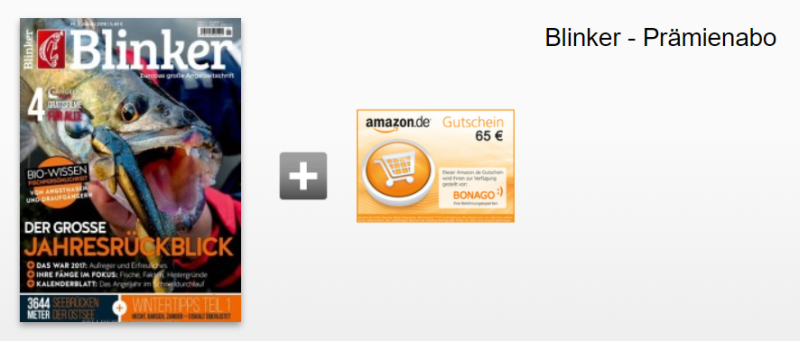 Sicher keine Zeitschrift mit Millionenauflage, aber für den Einen oder Anderen vielleicht trotzdem ein guter Deal: Das Jahresabo des Angel-Magazins „Blinker“ gibt es momentan für 68,40 Euro und als Prämie einen 65,- Euro Amazongutschein oder einen Verrechnungsscheck über 60,- Euro.