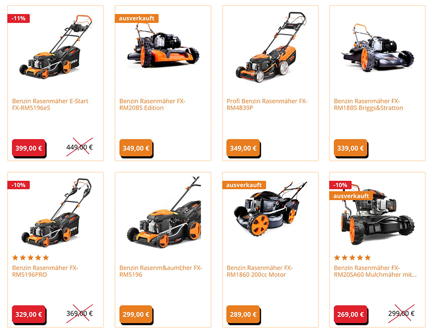 Zu den Aktionskategorien zählen: Rasenmäher, Heckenscheren, Rasentrimmer, Motorsensen, Motorsprüher und Rasenpflegeprodukte.