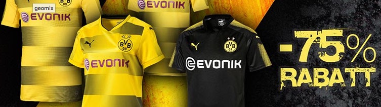 Bei Geomix gibt’s gerade einen fetten Sale mit bis zu 75% Rabatt – z.B. die aktuellen BVB Trikots mit satten 75% Rabatt.