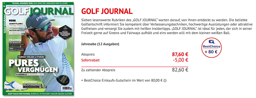 Jahresabo mit 12 Ausgaben GOLF JOURNAL für 82,60 Euro – als Prämie: 80,- Euro BestChoice Gutschein