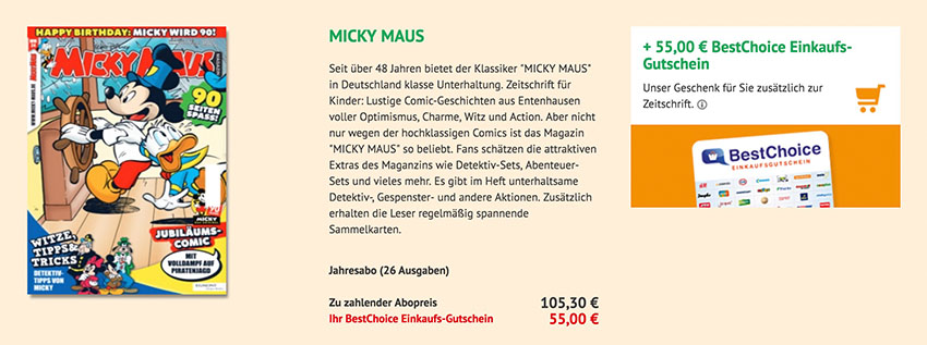 Jahresabo (26 Ausgaben) MICKY MAUS für 91,65 Euro – als Prämie: 50,- Euro BestChoice Gutschein