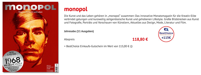 Jahresabo mit 11 Ausgaben der Zeitschrift monopol für 118,80 Euro – als Prämie: 115,- BestChoice Gutschein