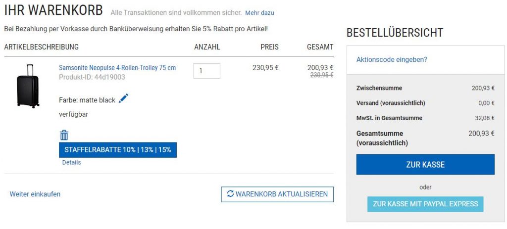 Der entsprechende Rabatt wird automatisch im Warenkorb abgezogen. Weitere 5% Rabatt erhaltet ihr dann noch für die Zahlung per Vorkasse.