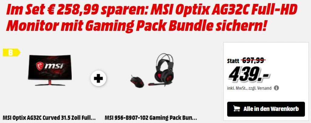 Ebenfalls bei MediaMarkt bekommt ihr heute Abend das MSI Optix AG32C Curved 31.5 Zoll Full-HD Gaming Monitor Bundle mit Gaming Maus + Gaming Headset für nur 439,- Euro inkl. Versand.