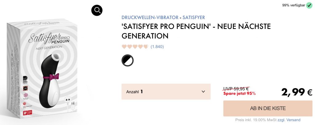 Bei Eis.de erhaltet ihr aktuell den Satisfyer Pro Penguin (2nd Gen.) für nur 8,96 Euro inkl. Versand.