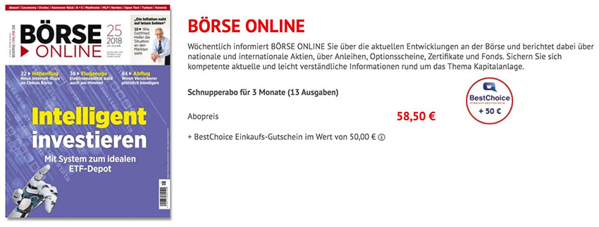 Schnupperabo mit 13 Ausgaben BÖRSE ONLINE für nur 58,50 Euro – als Prämie: 50,- Euro BestChoice Gutschein