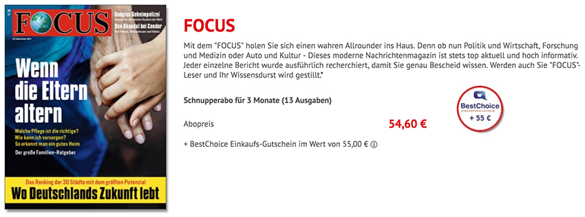 Dabei bestellt ihr das Schnupperabo des FOCUS für nur 54,60 Euro und der Prämienempfänger erhält einen schönen 55,- Euro Bestchoice Gutschein als Dankeschön.