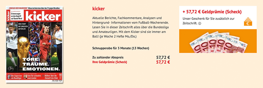 Schnupperabo (26 Ausgaben) der Zeitschrift kicker für 57,72 Euro – als Prämie: 57,72 Euro Verrechnungsscheck