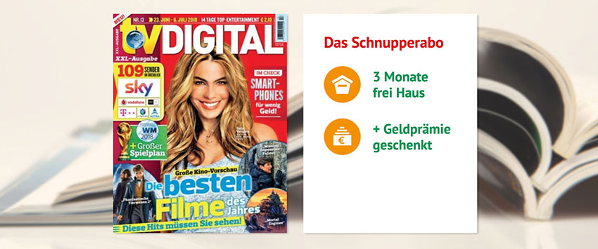 Bei KioskPresse erhaltet ihr momentan ein dreimonatiges Schnupperabo mit 7 Ausgaben der tv DIGITAL XXL für 17,85 Euro inkl. Zustellung.