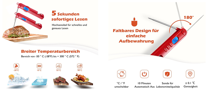 - Eignet sich als Messgerät für’s Grillen, BBQ, Steak, Truthahn, Sirup, Milch und Badewasser