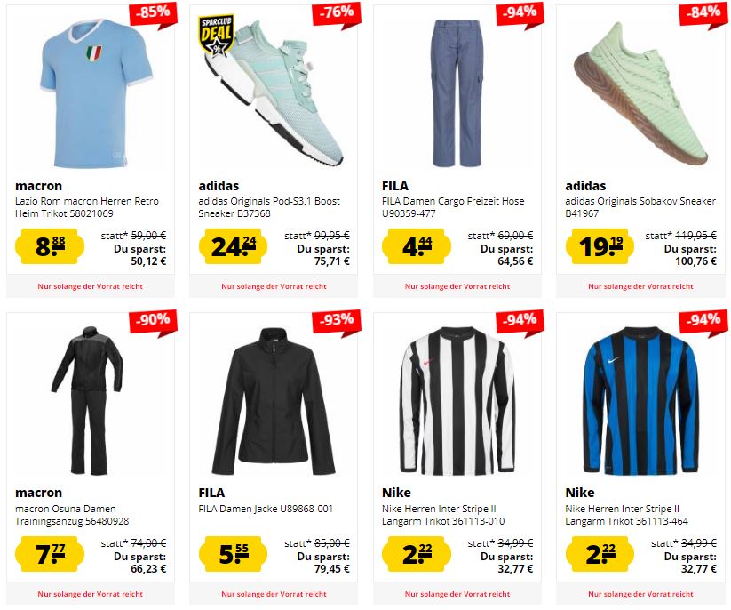 Insgesamt stehen euch hier rund 100 Artikel zur Auswahl vieler bekannter Topmarken wie Russell, Nike, Adidas oder Puma zwischen denen ihr euch entscheiden könnt. Wie typisch für SportSpar benötigt ihr keinen extra Rabattcode, denn die angezeigten Preise entsprechen schon den reduzierten Angeboten.