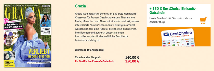 Aktuell bekommt ihr das Jahresabo der Zeitschrift „Grazia“ für nur 160,- Euro – dazu gibt es als Prämie einen 150,- BestChoice Gutschein.