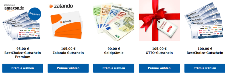 Es stehen wie üblich mehrere Prämien zur Auswahl: Ihr könnt z.B. einen 105,- Euro Zalando Gutschein, einen 105,- Euro Otto-Gutschein oder aber einen Verrechnungsscheck über 90,- Euro wählen.