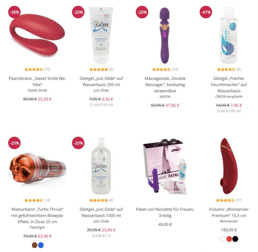 Mit von der Partie sind neben verschiedensten Damen- als auch Herrentoys auch viele Zubehörartikel. Hier ist wirklich für jeden Geschmack was zu finden. Ihr findet beispielsweise auch einige Partnertoys in der Aktion. Viel Spaß beim Shoppen!