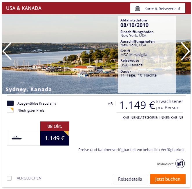 MSC haut gerade einige richtig gute Frühbucherangebote raus, die teilweise in die Herbsferien fallen: Beispielsweise kann man auf der Aktionsseite die Route USA & Kanada ab New York im Oktober ab 1149,- Euro pro Person inkl. Premium Getränkepaket buchen.