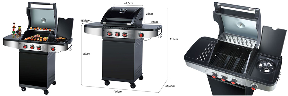 - Gasverbrauch: ca. 835 g/h (3 Hauptbrenner je 218 g/h + 1 Seitenbrenner 181 g/h)